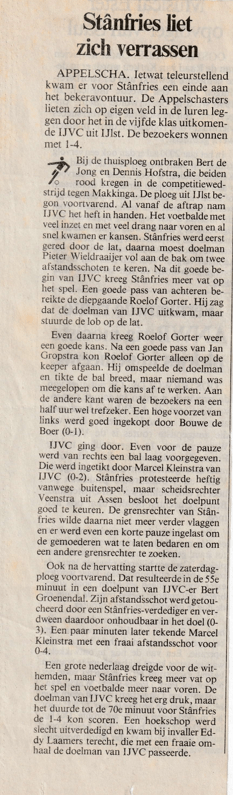 Veertig jaar geleden gedurende het seizoen 1984/85 reikte IJVC tot de vierde ronde van de beker. In de eerste ronde werd Oosterlittens (1-1) na verlenging uitgeschakeld. In die verlenging scoorden Auke Cnossen (2) en Arie Hoekstra zodat de eindstand 1-4 werd. Een maand later moesten de Kypmantsjes op bezoek bij QVC en ook hier werd het 1-4. In de derde ronde was Blauwhuis (met doelpuntenkanon Gerard Popma in de gelederen) de tegenstander. De nieuwbakken KNVB club verloor in IJlst met 3-2.