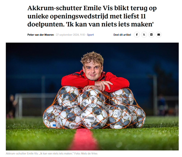 Ook in competitieverband weet Akkrum het net wel te vinden, zoals eerder al geschreven een dikke overwinning in de eerste competitiewedstrijd. In totaal scoorde de ploeg al 26 keer in de competitie maar kreeg het ook al 9 tegentreffers te verwerken. Tegen de onderste drie ploegen kon Geertsma de bal al zes keer uit het net halen.