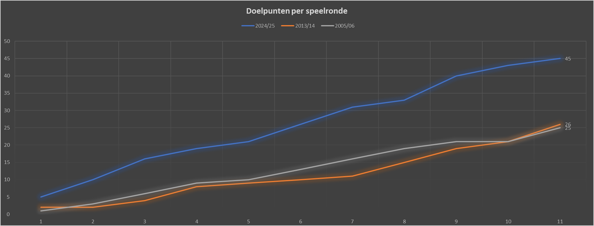 In 2013/14 (62) en 2005/06 (60) scoorde IJVC aan het einde van het seizoen de meeste treffers. Hoe staat het ervoor na elf speelronden? Met het huidige moyenne lijkt dit seizoen een nieuw record neergezet te gaan worden.