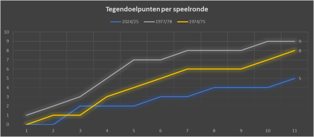 Het aantal tegendoelpunten ligt met vijf ook onder de huidige recordseizoenen van 1977 (14) en 1974 (15). Destijds werden er wel 22 competitiewedstrijden in plaats van de huidige 26 gespeeld.