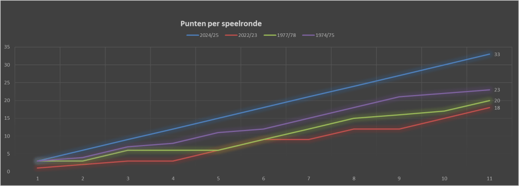 We zijn nog niet eens halverwege maar een puntenrecord in de vierde klasse lijkt een kwestie van tijd te zijn. De 46 punten die de selectie in 1975 het kampioenschap opleverden zullen in het jubileumjaar overtroffen gaan worden. Twee seizoenen terug eindigde de selectie op veertig punten maar had na elf speelronden pas 18 punten bij elkaar gespeeld.