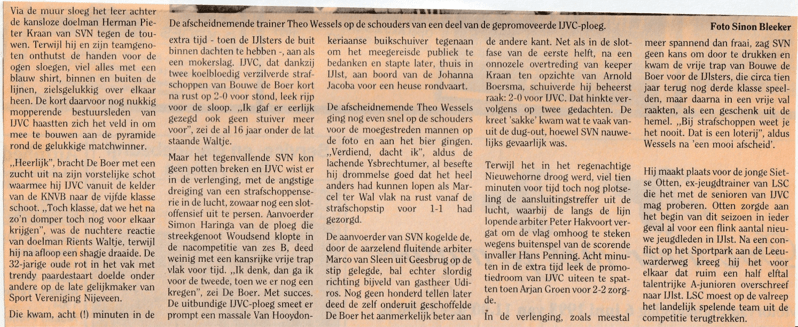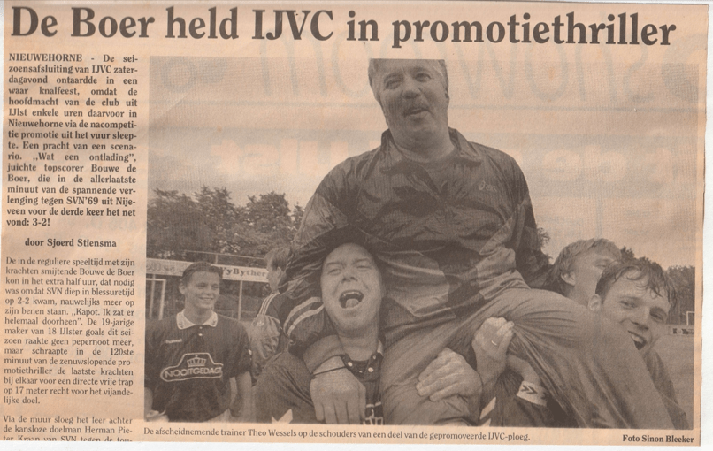 Door al deze verschuivingen kwam IJVC in de zesde klasse terecht en Theo Wessels is de man die IJVC hogerop moet brengen. In zijn eerste seizoen eindigt de selectie onder zijn leiding op een vijfde plaats achter HJSC, Nijland, Joure en Oudehaske. Door de scoringsdrift van junior Bouwe de Boer scoort IJVC er na de winterstop in het seizoen erop lustig op los en bereikt het de nacompetitie waarin het eerst Woudsend en daarna SVN ’69 (3-2, red) verslaat. Grote man in de finale is diezelfde Bouwe de Boer die alle drie de treffers voor zijn rekening neemt. IJVC promoveert naar de 5e klasse (de foto op het programmaboekje).