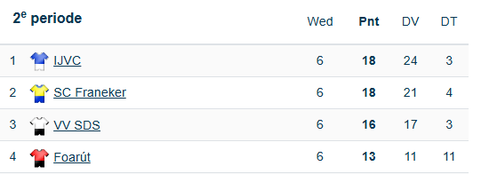 We gaan ook weer richting het einde van de 2e periode in de competitie waar drie ploegen voor in aanmerking lijken te komen. De eerste periode is al in ons bezit en wij doen dus niet meer mee. Wel treffen de bovenste drie ploegen elkaar nog komende weken. Zaterdag is het Franeker – SDS, dan IJVC – Franeker en als laatst SDS – IJVC. Foarút treft met Marrum, SSS ’68 en Deinum mindere tegenstanders en mag blijven hopen op een prijs. We speelt de 7-0 nederlaag tegen ons ze parten wanneer het op doelsaldo aankomt (niet waarschijnlijk maar toch).