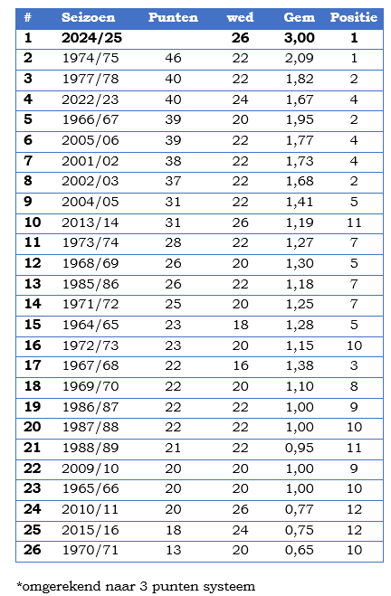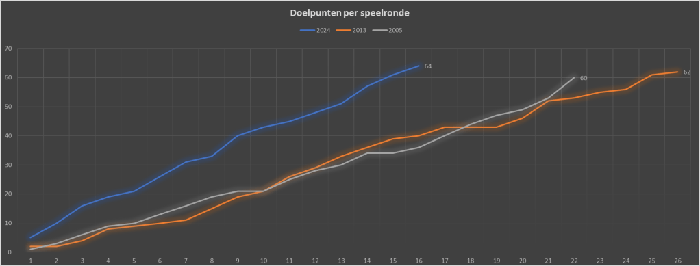 Wanneer we kijken naar de gescoorde doelpunten in een seizoen zien we dat de huidige 64 doelpunten een nieuw record zijn. De 62 uit het seizoen 2013/14 wordt daarmee naar de tweede plek verwezen.