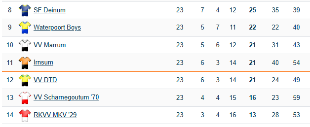 Waar wij zonder zorgen het veld op stappen, kijken we ook even onderin de stand. Door de resultaten van afgelopen weekend staan er nu drie verenigingen op hetzelfde puntenaantal. Wie de nummer twaalf in deze competitie wordt zal blijken na een spannende slotfase. Scharnegoutum moet zorgen dat het MKV ’29 voorblijft in punten, want hun doelsaldo is minder rooskleurig dan de hoofdstedelingen.