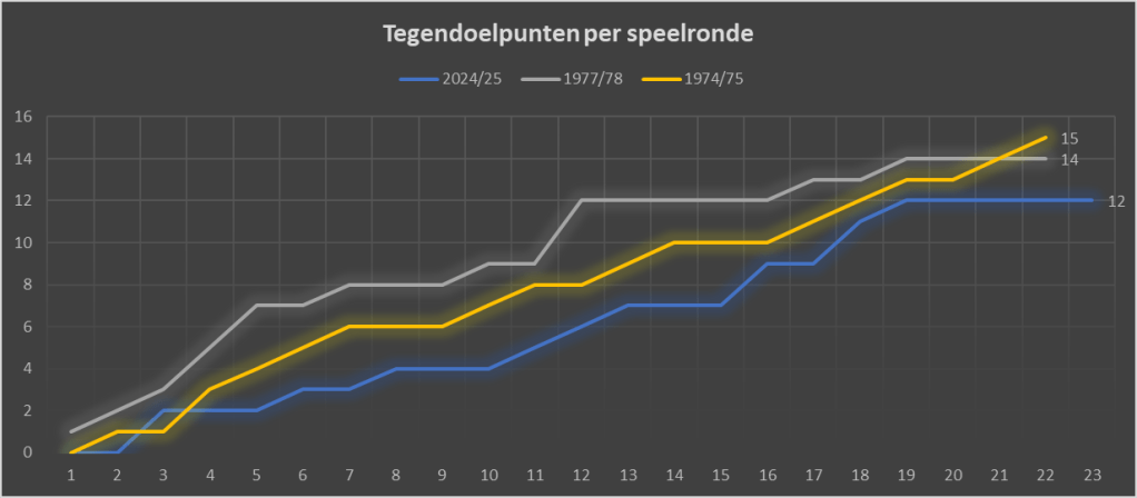 Wanneer we het aantal tegendoelpunten langs de lat leggen zien we dat de huidige verdediging twaalf keer gepasseerd werd. De veertien en vijftien tegendoelpunten uit de jaren ’70 zijn dus meer waardoor dit ook een record is. Tegenwoordig zijn de competities groter en worden er dus meer wedstrijden gespeeld. Lukt het ook na 26 wedstrijden onder die 14 of 15 te blijven??