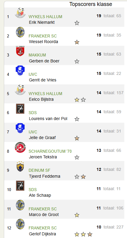Met zijn twee treffers tegen ons wist Erik Niemarkt zich in de top van het topscorersklassement te vestigen. De topscorer zal ook dit seizoen niet uit IJlst komen, maar weet Jelle de Graaf zijn teamgenoot Gerrit de Vries nog te achterhalen?