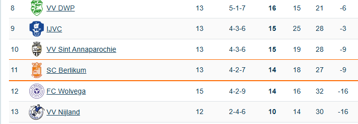 Na drie wedstrijden stond DWP trots aan kop maar daarna volgde een gelijkspel tegen Nijland, en vier nederlagen (Sint Anna, Berlikum, VHK en Balk) op rij. Het herstel kwam er tegen GAVC en Swift maar afgelopen weekend ging het opnieuw onderuit tegen Minnertsga. Zodoende heeft de ploeg uit Sint Johannesga twee punten meer verzameld dan IJVC.