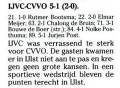 Van de afgelopen vijf wedstrijden verloor IJVC er maar één, teksten die we vorig jaar niet hoefden te schrijven. Op zich is het positief dat er minder verloren wordt, echter wordt het tijd dat er ook weer eens een overwinning over de streep getrokken wordt. Of dat tegen de huidige koploper CVVO lukt is te bezien, maar we hoeven voor niemand bang te zijn. De ‘Kypmantsjes’ spelen hun eigen spel alleen is het in de afronding de laatste tijd niet erg succesvol.