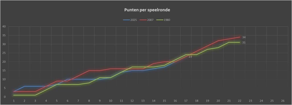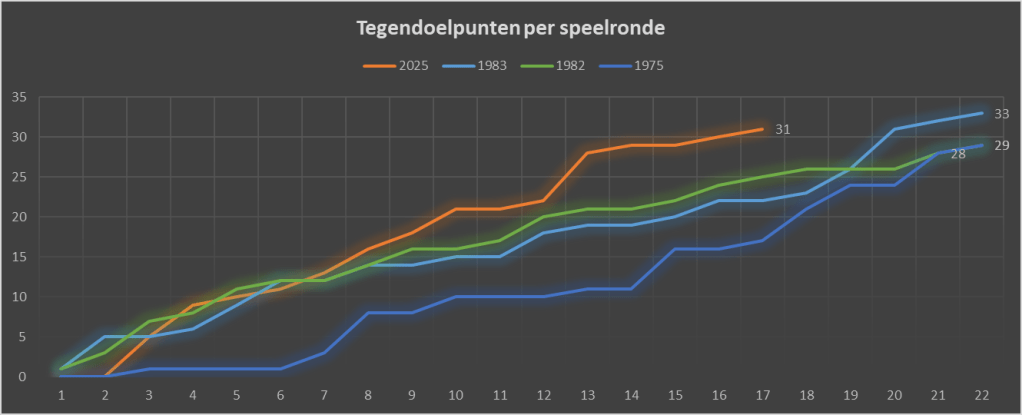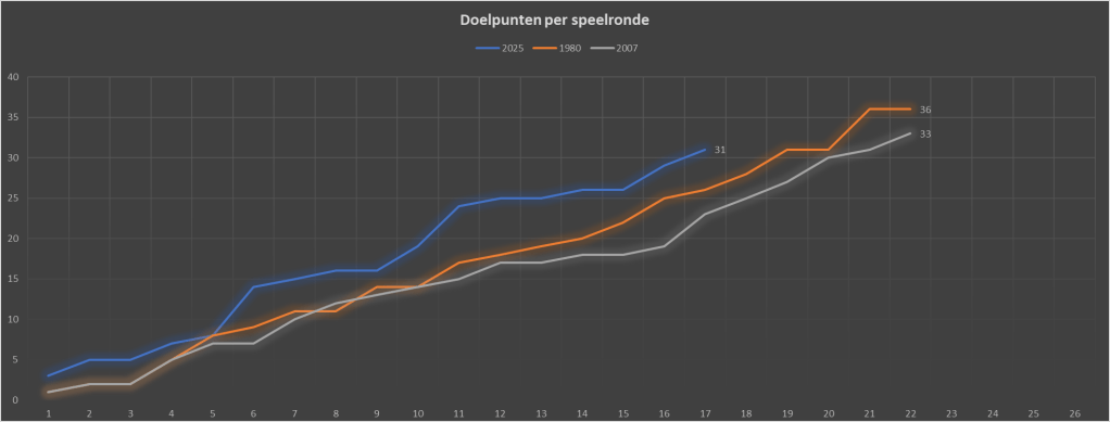 Het aantal doelpunten loopt op schema om richting een record te gaan. Nog vijf treffers zijn nodig om het record van 36 uit 1980/1981 te evenaren.