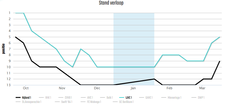 Als we de stand erbij pakken zien we nog steeds een scheefgroei in de stand, deze zal pas 4 april weer een beetje rechtgetrokken worden wanneer AVC – DWP en Nijland – Berlikum afgewerkt zullen worden. Wel bezetten de ‘Kypmantsjes’ nu de vijfde plek op de ranglijst en hebben een kleine marge opgebouwd naar de gevarenzone. De week na de wedstrijd tegen Nijland heeft IJVC geen competitieverplichting en kan dus toekijken hoe de concurrentie het gaat doen. Pas op 11 april is de volgende wedstrijd wanneer Sint Annaparochie op bezoek komt.