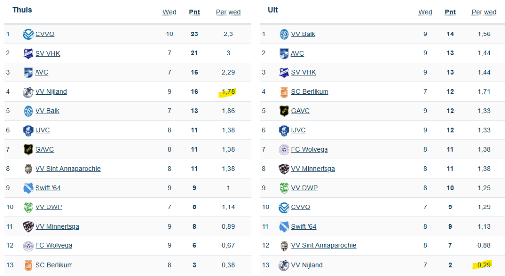 Twee punten in zeven uitwedstrijden is een gemiddelde van 0,29 punt per wedstrijd en daarmee zijn ze veruit de slechtst presterende vereniging. Op bezoek bij Berlikum en DWP kon er een punt bijgeschreven worden. Nu verloor Nijland de laatste vijf wedstrijden niet, maar wellicht heeft dat ook te maken dat het vier daarvan op het eigen Zweitse Huitema Sportpark afwerkte.