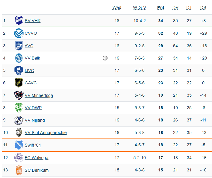 Met een overwinning op Wolvega heeft de selectie zich wat ademruimte verschaft richting de onderkant van de ranglijst. De thuisploeg die precies een week boven de streep heeft gestaan vindt zichzelf na de nederlaag terug op plek twaalf. Een plek daaronder staat Berlikum dat verloor van koploper VHK. Sint Annaparochie won van Balk welke nu al vier wedstrijd op rij niet wist te winnen en AVC zag passeren op de ranglijst. Ook onze komende tegenstander Nijland wist te winnen, al leek het daar na de gelijkmaker in de blessuretijd niet meer op. Echter in de absolute slotfase bleven de drie punten toch op het eigen sportpark.