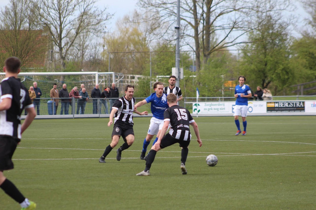 De eerste helft kende weinig hoogtepunten vanuit IJVC-oogpunt. Het spel was bij vlagen ronduit bedroevend en de ploeg wist maar moeilijk in zijn ritme te komen. Het dieptepunt was een ongelukkige botsing tussen Mohamad en Spoelstra, wat tekenend was voor de rommelige fase waarin IJVC zich bevond. Toch kwam IJVC nog goed weg. Sint Annaparochie kwam op voorsprong via Phenmar Bom, die de 0-1 binnenschoot. Lang kon de ploeg daar echter niet van genieten. Uit een corner was het Brian Bruggenkamp die zijn scherpte weer eens toonde en zijn vijfde van het seizoen binnenkopte. Ondanks het matige spel mocht IJVC zo toch met een gelijke stand de kleedkamer opzoeken.