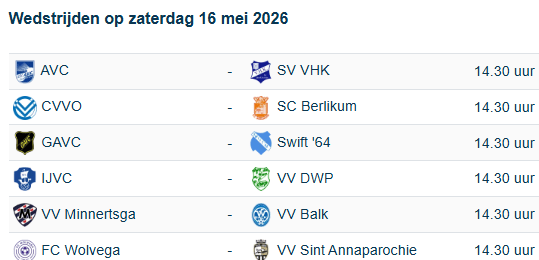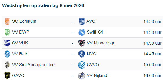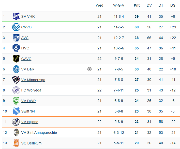 Zo was Sint Annaparochie de dubbele, na het eerder opstappen van trainer Oosterhaven, verliezer van het weekend na de nederlaag tegen AVC. Tussen nummer acht Wolvega en de bezitter van de rode lantaarn Berlikum zitten maar vier verliespunten. En met DWP – Swift ’64, Wolvega – Sint Annaparochie, Berlikum – Wolvega en Sint Annaparochie – Nijland staan er nog enkele krakers op het programma. Wellicht dat de ploegen onderin ook belangrijk in de titelstrijd kunnen zijn, want beide hebben de punten hard nodig.
