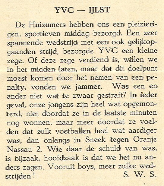 Eindelijk komt er bericht dat IJVC meedoet aan de competitie, zij het in de 2e klasse. Doordat de competitie al ver gevorderd was speelde IJVC een enkele competitie. Half juni werd IJVC zelfs gekroond tot kampioen.