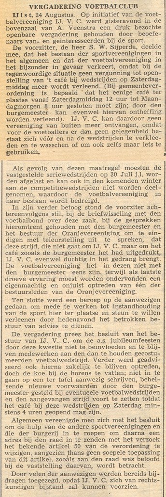 Maar wat nu? Door deze opstelling van de burgemeester kunnen geen seriewedstrijden meer gespeeld worden en valt de competitie stil. Het IJVC bestuur belegt een openbare ledenvergadering over dit onderwerp en besluit een verzoek tot ontheffing te sturen naar de gemeenteraad. Er gaat een handtekeningenlijst rond door het stadje en bijna alle burgers verklaren zich solidair. Deze actie levert uiteindelijk het gewenste resultaat op, want het café gaat op zaterdagmiddag weer open en er kan weer gevoetbald worden. Maar al deze problemen zorgen wel voor een terugloop in het ledenaantal.