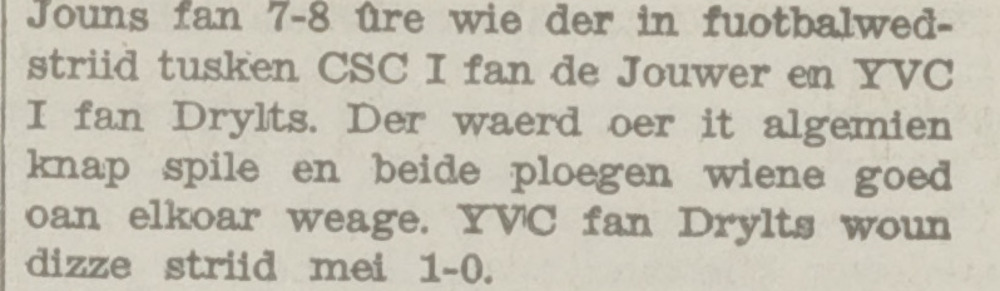 Voordat het seizoen van start ging speelde IJVC een oefenwedstrijd in Oudega bij de skoalle- en folksfeesten tegen CSC (Joure).