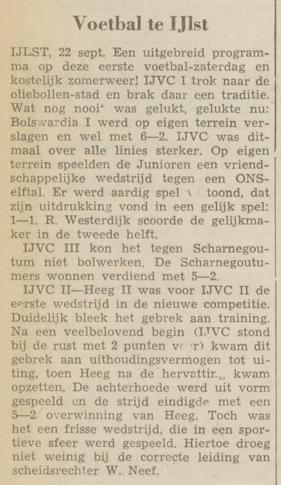 | 06-10 | IJVC | 3 | – | 0 | Delfstrahuizen | IJpe de Boer (2), Piet Zwaagman |