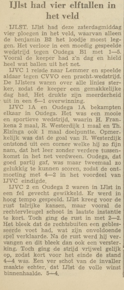 | 4-10 | IJVC | 4 | – | 5 | Oeverzwaluwen | Willem de Jong (2), Klaas Visser, Sint de Vries |
