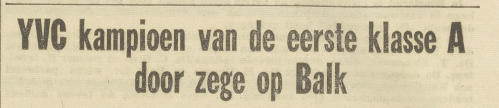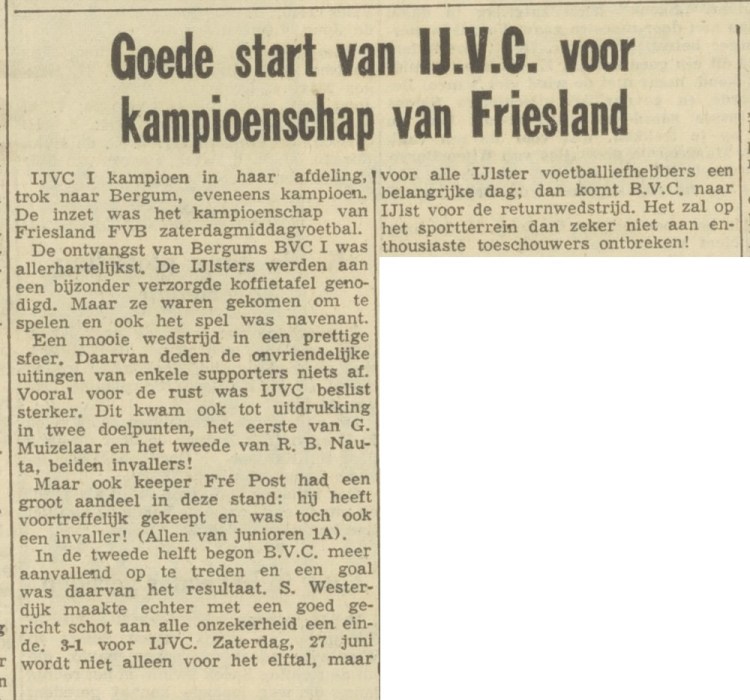 Kampioen worden betekend ook dat er gespeeld mag worden uit de kampioen uit de eerste klasse B om te bepalen wie zich kampioen van Friesland noemen mag. IJVC mocht de degens kruisen met BCV (Bergumer Christelijke Voetbalvereniging) en begon goed. Met Fré Post als invaller op goal werd uit met 2-3 gewonnen.