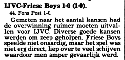 Na de winterstop moet IJVC toch weer aan de bak aangezien ze in de gevarenzone bivakkeren. Om Friese Boys onder zich te houden moet er begin maart met deze tegenstander afgerekend worden. Vanaf de aftrap laat IJVC haar aanvallende bedoelingen zien. Arie Hoekstra probeert vanaf de middellijn de doelman te passeren, maar helaas. De thuisploeg krijgt legio kansen maar weet die niet te benutten. Vlak voor rust is het Fons Post die de belangrijke 1-0 op het bord zet.
