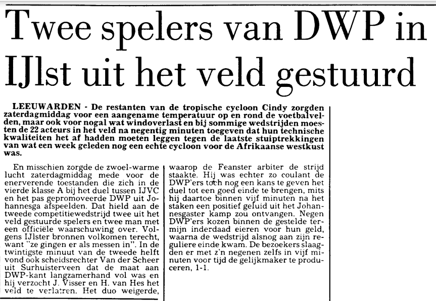 In de tweede wedstrijd van het seizoen tegen DWP gebeurde er van alles. De wedstrijd verloopt negatief en het spel van de tegenstander kan het beste als antivoetbal worden aangemerkt. Waar IJVC het betere van het spel heeft komt het moeilijk tot scoren, alleen Willem Spoelstra weet het net te vinden. Na rust worden twee spelers van DWP van het veld gestuurd die weigeren te vertrekken zoals te lezen is in het verslag van het LC.