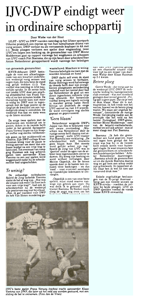 Half november staat dan de wedstrijd tegen DWP op het programma, en afgelopen seizoen liep deze wedstrijd uit de hand. Zou het nu binnen de perken blijven? Het antwoord daarop is nee. De kop in het LC luidde als volgt in het sportkatern: IJVC-DWP eindigt weer in ordinaire schoppartij.
