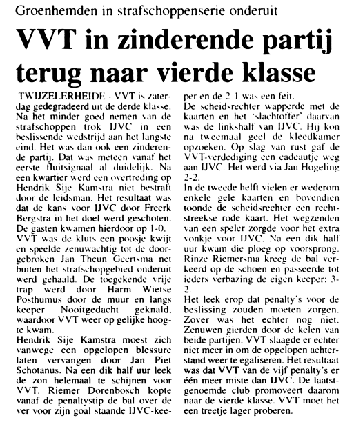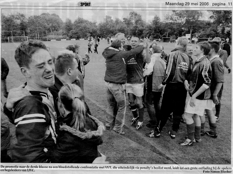 De strafschoppen werden genomen door; Simon Haringa, Bouwe de Boer, Heinze Schouwenaars, Renier Kramer (mis) en Nolke Posthuma. En doordat VVT een miste en keeper Nooitgedagt er één pakte promoveerde IJVC naar de derde klasse.