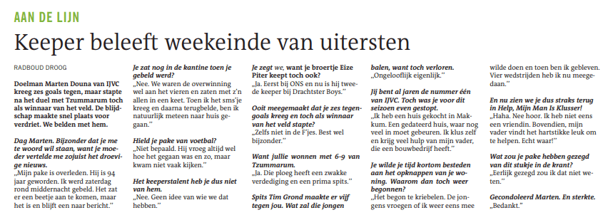 | 31-10 | Tzummarum | 6 | – | 9 | IJVC | Elmar Meijer (3), Rens Soenveld (2), Jordin Broekhuis, Marco Fijlstra, Tom Pronk, Rijkel Dotinga |
